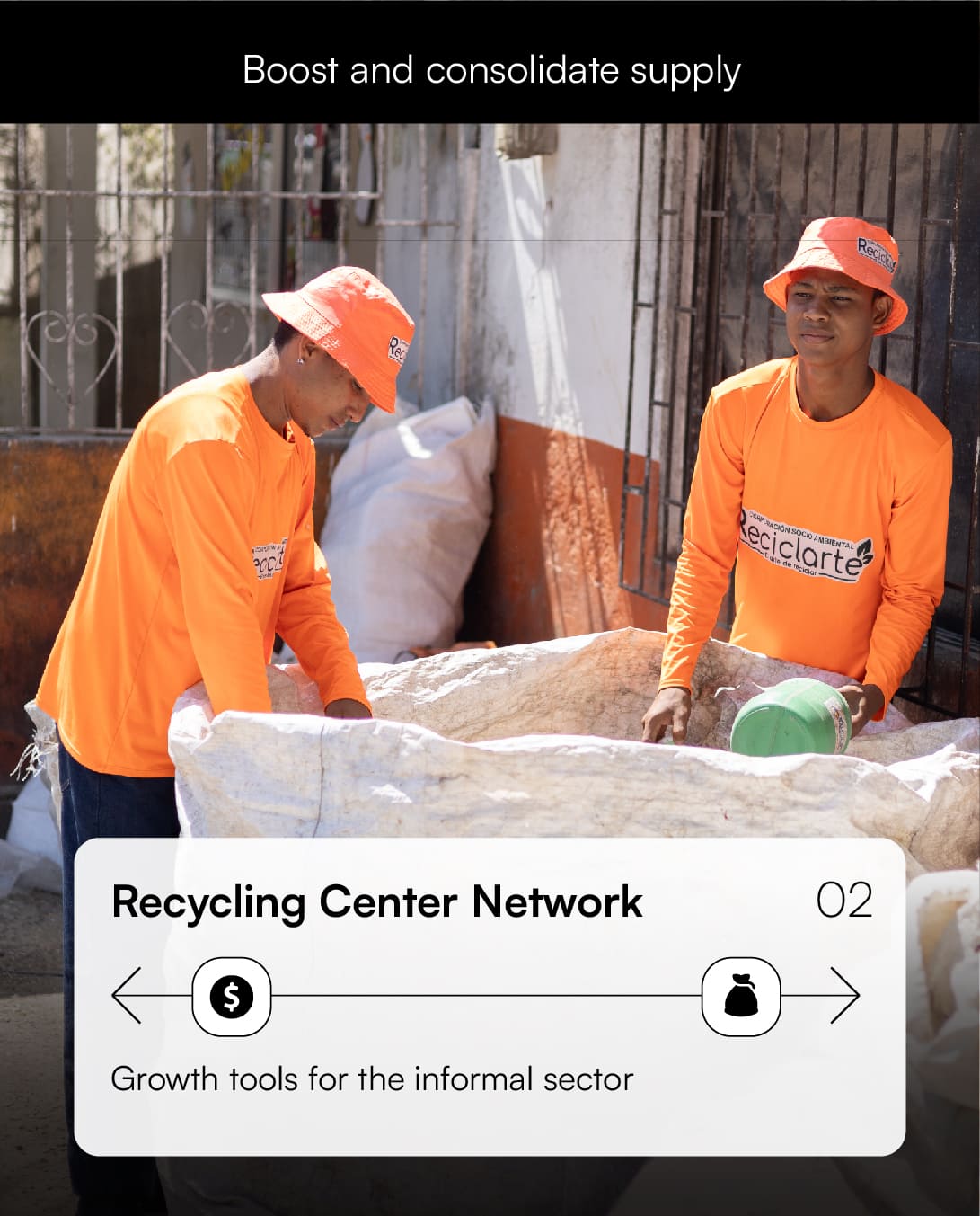 Strengthens the informal recycling ecosystem with its proven methodology (training, tools, and financing) to increase volumes of recyclable material.